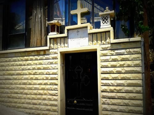 وعن بناء المزار يتحدث "اللاطي": «المزار اليوم عبارة عن غرفتين وسرداب طويل مغلق، الغرفة الأولى تشبه القاعة الواسعة، وتوجد فيها بعض الأيقونات المقدسة وصليب من الخشب موضوع عليه أيقونة المصلوب، جدران الغرفة الأولى نصفها السفلي من الحجر، والنصف العلوي من الزجاج، تحتوي هذه القاعة باباً قديماً وعريضاً من الحجر يعدّ من البقايا التاريخية للمزار، ويتميز بأنه قصير؛ فأي شخص يريد أن يعبر من خلاله يجبره على الانحناء بخشوع للمكان المقدس؛ فهو باب الغرفة الداخلية؛ وهي الغرفة الثانية للمزار، الغرفة أو الحجرة الداخلية الثانية مبنية من الحجر القديم تحتوي عدداً من الأيقونات المقدسة وصليباً كبيراً، كما توجد ستائر من الأقمشة قدمها أحد سكان القرية لتغطي السرداب الذي يبدأ من هذا المكان ولا نعرف أين ينتهي؛ فهناك من يقول إنه ينتهي في "قلعة الحصن"، وآخرون يقولون إن نهايته في حارة أخرى من القرية، لكن حتى اليوم لا نعرف تماماً أين نهايته».