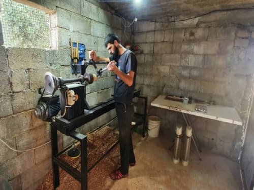 ويضيف : «كانت مشاهدتي لمقطع فيديو بسيط عن شخص يحول قطعةً من الحطب إلى كأس، ملهِمةً لي لبداية رحلتي مع خراطة الأخشاب... بدأت بالبحث والتخطيط لأعزز هوايتي، ووضعت مخططاً للمشروع والحصول على الآلات اللازمة للعمل، كانت مخرطة الخشب غير متوفرة بالبلد وإذا وجدت فإن تكلفتها كانت كبيرة، فقررت تصنيعها بناء على خبرة اكتسبتها بأعمال الحدادة والكهرباء، بفعل أعمال حرة مارستها... حصلت على الحديد وقطعته بالمقاسات المطلوبة وقمت باللحام لتشكيل الهيكل الكامل للمخرطة، لأصمم المحرك لماكينة بسيطة تؤدي العمل المطلوب بتكلفة أقل بكثير من شراء القطع الجاهزة، كذلك صنعت الأزاميل الخاصة بالخراطة من مواد أولية لعدم توفرها، لأنها كانت غالية الثمن في حال توفّرها».