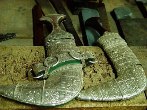 وبعد ذلك نقوم بتنعيم السطح الخشبي بالمبرد حتى يصبح أملس، وتصبح قطعتا الخشب متقنتين تماماً– نفصلهما ثم نجوف كلاً منهما تجويفاً على شكل شفرة الخنجر مستخدمين في ذلك المطرقة والأجنحة، ثم نلصقهما معاً مرة أخرى. وبالنسبة للجزء الأمامي نستخدم قطعة الجلد المطرزة بالفضة وتسمى (الزمة). ونقوم بتثبيت حلقتين متصلتين بأحزمة من الجلد عليها خيوط فضية على الجانبين، ثم نربط الحزام حول الخنجر. وبعد ذلك نقوم بملء بعض الوحدات الزخرفية أو النباتية أو أشكال الحيوانات على المقبض سواء أكان من مادة البلاستيك أم القرن بالفضة بواسطة القلــم (المسمار المفلطح الرأس) والمطرقة والمادة اللاصقة.