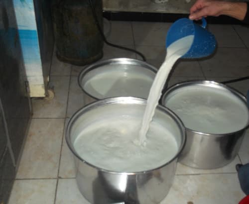 الآن الحليب يوضع في أواني بلاستيكية في البراد.
