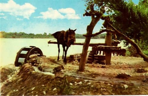"الدواليب" التي تشتغل على ستة بغال لا تقف، حيث يشدون على كل "دولاب" بغلين في آن واحد مدة أربع ساعات بلا توقف وكل أربع ساعات يغيرون بغلين ويقال لهذه المدة "عدة" يعينونها بظل مسمار مدقوق على قطعة من الخشب موضوع عليها إشارات بين الإشارة والإشارة أربع ساعات، فكلما وصل الظل إلى إشارة غيروا البغال ويستمر عمل "الدولاب" 24 ساعة بلا انقطاع».