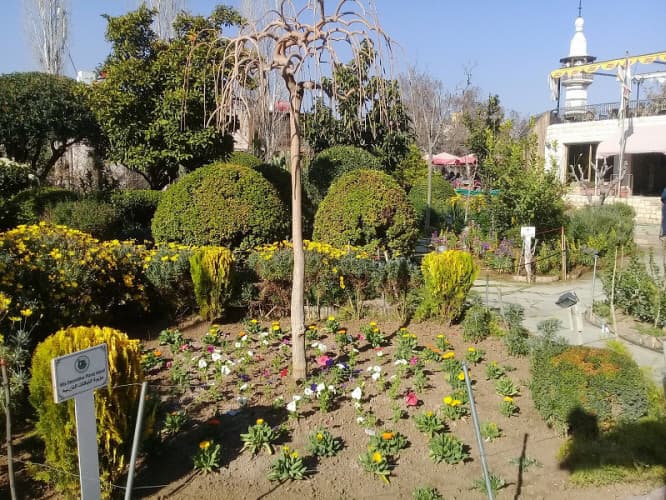 بين مجموعة من البيوت القديمة المتناثرة على الجهة الغربية لمحيط قلعة دمشق، ثمة بقعة خضراء هادئة تنقل الزائر من تلوث وضجيج المدينة المعتاد إلى نقاء الطبيعة وهدوئها الآسر، حديقة من النباتات والأزهار التي تسرق قلوب المارة بجمال ألوانها وحسن تنسيقها، باختصار منظر يريح النظر بعد مسير طويل عبر الأبنية الإسمنتية والطرقات الإسفلتية.