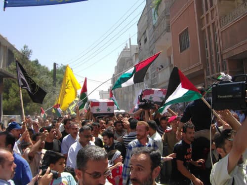 في المساء كان مخيم العائدين على موعد مع حفل تأبيني حاشد للشهيدين البطلين، حضره المهندس"محمد إياد غزال" والشخصيات الرسمية في المحافظة.