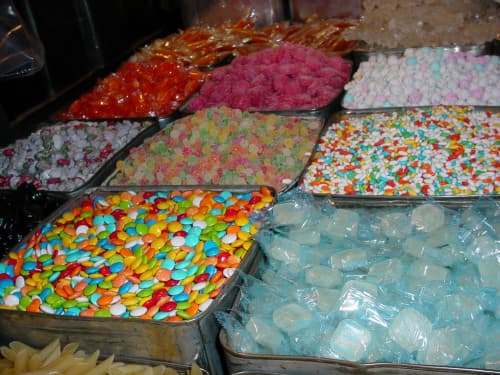 الكبار والصغار يتناولون السكاكر والحلويات بكافة أنواعها، فنلاحظ أنواعاً كثيرة منها بأشكالها ومذاقاتها، وفي القديم قبل ظهور الآلات الحديثة كان الناس يتناولون الحلويات والسكاكر العربية القديمة المصنوعة بطريقة تقليدية، وإلى الآن نجد بعض هذه السكاكر موجودة في سوق البزورية "بدمشق"، وأهم هذه السكاكر "الشمر" المعروفة "بحب العزيز"، و"السكر الألماسي"، إضافة إلى "حب الشوكلاه" (السميري)، هذه السكاكر ذات شكل رائع ومذاق لذيذ وخصوصاً للأطفال.