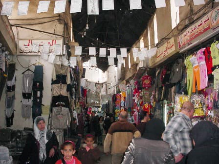 موقع eSyria بتاريخ 12/4/2009، التقى السيد "عدنان عكاشة" صاحب آخر محل لبيع الصوف في سوق "الصوف" بدمشق، والذي حدثنا عن تاريخ هذا السوق بقوله: «يمتد هذا السوق المغطى من الغرب إلى الشرق موازياً لسوق "مدحت باشا" من الجنوب، فهو يقع بين سوق "القطن" وجادة "الشماعين"، ويغطّي قسمه الشرقي ستار هرمي من المعدن يحجب عنه الضوء،