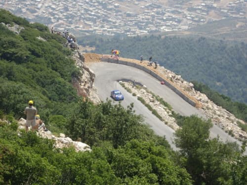 رغم المنعطفات القاسية والكثيرة التي ترافق الطريق، ورغم أن المسير زاد عن الساعة بعد "القرداحة" لم يفقد أحد متعة الرحلة في الحافلة، تتصاعد الهضاب، وتتكلل قممها بالأرز والصنوبر والغار، وتتآلف صخورها الحراجية الصلبة مع نسماتها الجبلية العليلة المنعشة، هناك في القمة الأعلى التقى جمهور كبير من جميع أنحاء العالم (إعلام، ومهتمين، ومشجعين..) ليتمتعوا بتحدي "تسلق الهضبة نسمة جبل"