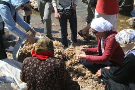 "لانا، وشذى" ساعدتا "أم خالد" في عملية تنقية خصل الصوف من الأوساخ قبل غسيلها بالماء، "أروى، إيمان، ماجد، محمد، وعبد الله" جرّبوا فكرة غسيل الصوف بالــ"المخباط"، وبدت تجربة مثيرة للجميع.