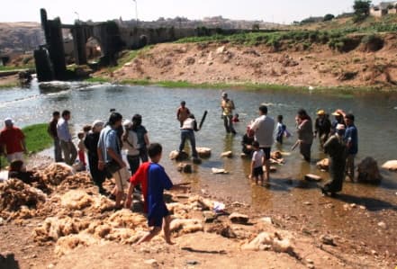 "أم خالد": امرأة من "طيبة الإمام" قررت اصطحاب عائلتها في هذا اليوم لغسيل الصوف من أجل إعداد فراش عرس ابنها.