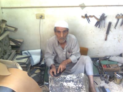 «تعلمت الصنعة على يد المعلم "مهيدي صالح العرفي" والذي كان محله بسوق "الخبز المقبي" وهي تسمية سابقة لسوق "التجار" الحالي، وكان عمري حينها حوالي 8 سنوات، وقد روى لنا المعلم "العرفي" أن أول من أدخل هذه المهنة على "ديرالزور" هو "أبو أحمد العكيلي"، وكان محله في الشارع العام تحت عيادة الدكتور "معين العظم" رحمه الله، ثم جاء بعده في هذا الكار "إسماعيل الفخار" وكان محله في الشارع العام جانب وكالة "جابر عبيد العاني"، ثم ازداد عدد محالات تصنيع "الكلاشه" إلى 7 محلات، وجميعهم في منطقة "الشيخ ياسين" وتحديدا في الشارع العام والحارات المتفرعة منه، ولا تزال هذه المنطقة ليومنا هذا المركز الرئيسي لصناعة "الكلاشه" في "دير الزور"، أما بالنسبة للعدة المستعملة في صناعة هذه الكلاشه سابقا، فقد اقتصرت على (سكين حده ومقص ومدقة)، وكان يستغرق إنتاج ثلاث أجواز من الكلشه حوالي 12 ساعة تقريبا، بسبب عمليات الخياطة والتي كانت تتم يدويا، وكانت الخيوط تصنع من جلد الحيوان، وكذلك (النعل) فقد كان من جلد "جمل" حصرا على اعتباره قوي وقاسي، ومن الأعلى يوضع جلد "البقر"، وكنا نبيع الجوز بسعر 3.5 ليرات ونحن رابحين جدا، ثم بدأت في العام 1960 تتغير نوعية الجلد المستخدم في هذه الصناعة، وأستعيض عنها بإسفنج صناعي، كنا نشتري الكيلو منه بحوالي 8.5، ثم ارتفاع إلى 14 ليرة، إلى أن وصل اليوم إلى 135 ليرة، ومع هذا التغير في المواد المستعملة في التصنيع لم تعد صناعة الجوز من الكلاشة تستغرق أكثر من نصف ساعة أو حتى أقل، أما اليوم فلا تزال أغلب هذه العدة مستعملة، وزاد عليها المكابس وماكينات الخياط الحديثة، والتي باتت تؤمن سرعة في العمل، و"للكلاشه الديرية" ثلاثة أنواع: (الحجازي، الهجاني، بدون أصبع)، وقد وصل اليوم سعر "الهجاني" الجيد إلى بين 200 و250 ليرة، والحجازي ب 150 ليرة.