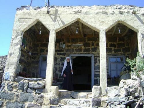 «هو ذاك الرجل الذي يحاكي التاريخ ويقف على أعلى قمة مسكونة تحوفها نسائم الهواء من الجهات الأربع، مضافته من الحجر البازلت وسقفها من القصب المقاوم للطبيعة، في وسطها مهباج عند الصباح تستمع إلى أنغامه ورائحة القهوة المرة العربية تفوح منها، تتذكر الماضي العريق، مضافة تحوطها أحجار البازلت القديمة، وديوانية ذات طابع تراثي واقعي، عندما تصل وتنادي بصوتك "وين راحو المعازيب"؟ يكون الشيخ "أبو نايف أجود درويش" المولود عام 1904 واقفاً كالسنديان يستقبل ضيوفه بصوته الأجش، مرحباً بهم».