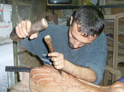في محل قديم من محال "الشيخ ضاهر" القديمة والمتناثرة هنا وهناك حول المسجد وقرب الساحة، محل صغير يعمل فيه شابان متوسطا العمر، من ورائهما معلمهما القديم في مهنته كل القدم، وعلى الطاولة الرئيسية عشرات الأزاميل متنوعة المقاييس تبعثرها لمساتهم لترسم لأعيننا مئات الأشكال والتماثيل.