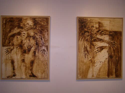 مساحات بيضاء تزاحمت عليها شخوص "كاظم" المغتربة، فحاولت التعبير بأصابع وآياد وعيون جامحة عن سبب وجودنا على هذا الكوكب كأنه قادم من عالم آخر، في حين كانت تلك الشخوص تتزاحم على سطح اللوحة بطريقة مسرحية وبطقوس دينية وأخرى تعبيرية صارخة، فخطوطه الحادة وتدرجه باللون البني المحروق إلى البرتقالي الفاتح كانت نقلة عبّرت عن الحالة التي تعيشها مخلوقاته التشكيلية الجامحة.