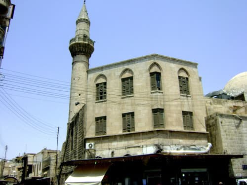 ومن وقفيات هذا الجامع خانان قريبان منه هما الخان الكبير والخان الأعوج ويقعان إلى الشمال الغربي منه في السوق القريب ومن وقفياته كذلك "حمام الواساني" الشهير الذي كان يضم جرناً أسودا يقال إن "إبراهيم الخليل" اغتسل فيه وقد هدم الحمام لتعريض الشارع الواصل بين الجامع الأموي وقلعة حلب».
