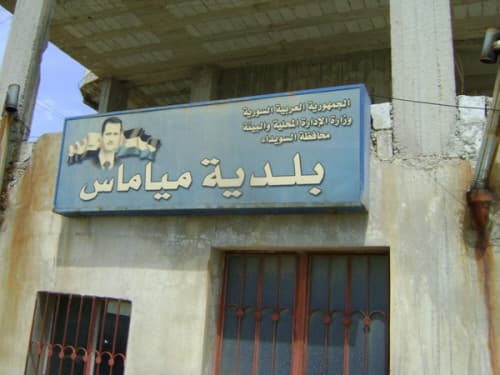 على بعد عشرين كيلو متراً من مدينة "السويداء" وضمن لفيف من الأشجار الحراجية وعلى مرتفع شاهق، وبين نسائم الهواء العليل النقي الذي يجول في فضائها، تتربع قرية "مياماس" التي تنطوي على تاريخ يعود إلى العصر الروماني والبيزنطي، وسط أشجار تدل على تاريخها حينما تلتقي في تلتها شجرة توت قدر عمرها بألفي عام، إضافة إلى حجارتها البازلتية التي تروي قصص الماضي التليد وتشتم بها رائحة الأصالة والكرم.