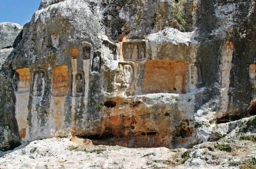 ويتابع: «كما تضم الصخرة الهائلة نواويس وأضرحة ومدافن أخرى محفورة في الصخر أسفل الأرض يُنزل إليها ببضع درجات، ويوجد في أعلى المدخل كتابة حفر في أعلاها تماثيل المتوفين من رجال ونساء وأطفال وذلك ضمن إطار خاص، وإلى الشرق من مدفن "طيطوس فلافيوس" تتواجد قبور مؤرخة من الأعوام 152 -195 -240، ما يجعلنا نرجع الكتابة على مدفن "طيطوس" إلى نهاية القرن الثاني أو بداية القرن الثالث الميلادي، ومن بين تلك القبور نجد إطاراً يحتوي على تماثيل أربعة أشخاص؛ اثنان منها إلى اليمين لامرأتين كما يبدو من تصفيف الشعر على طرف العنق، والآخران لرجلين يغطي رداء أحدهما رجليه وقد كُتب باليونانية من الأسفل على عمودين (ألولايوس صنع هذا لوالده وزوجة والده، أنا نيكانور صنعت هذا لوالدي أوديموس وزوجته)».