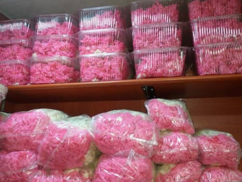 المرحلة الأخيرة تكون بوضع القطع المخلوطة مع القطر على طاولات رخام لمدة نصف ساعة، ثم نصبغ قسماً منها باللون الأحمر والآخر باللون الأبيض، وهو صباغ غذائي لا يضر بالصحة، ويعبأ بعدها بالتدريج اللون الأحمر ثم الأبيض ويقفل الكيس حسب الوزن الذي يباع على أساسه».
