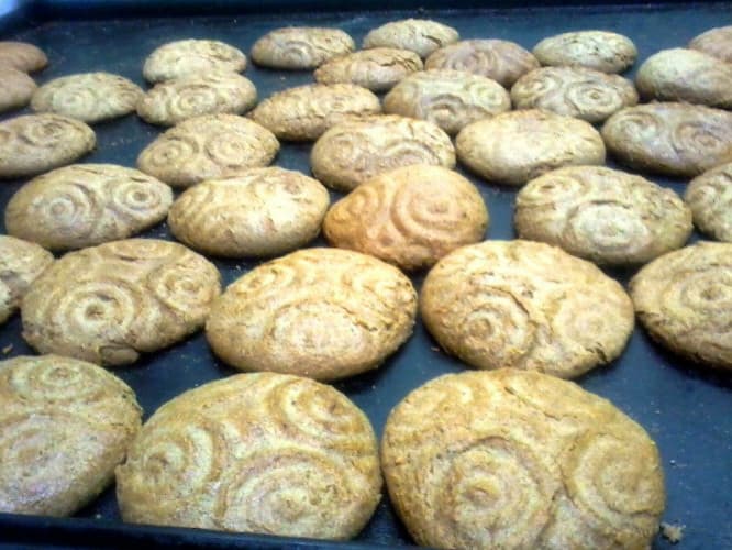 تخلط المواد الجافة جميعها، ثم تضاف إليها المواد الدهنية (زيت الزيتون، والزبدة والسمن) معاً، وتعجن حتى تتماسك، ثم تترك لتتخمر وتشكل في القالب ثم ترص في صينية وتوضع في الفرن ما بين 10-15 دقيقة، تخرج من الفرن وتدهن بالسمن العربي، وتترك حتى تبرد، ثم يرش عليها بعض السكر الناعم حسب الرغبة قبل تناولها».