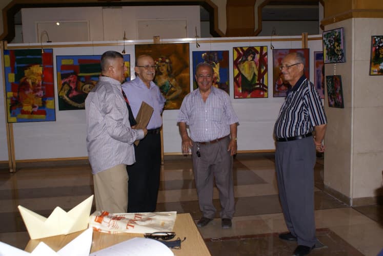 الفنان التشكيلي حسان أبو عياش مع مجموعة من الفنانين التشكيلين في المعرض
