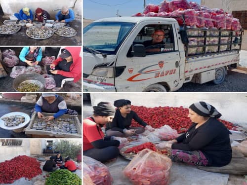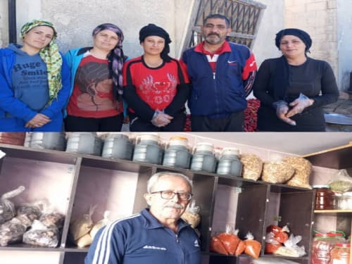 من جانبه، يروي زوجها حسن السلوم، من مواليد 1966، حاصل على معهد أرصاد جوية، تجربته في إدارة الورشات لمدونة وطن قائلاً:«بدأت هذا المشروع مع عائلتي منذ 25 عاماً، وسهّل الأمر عليّ امتلاكي سيارة نقل صغيرة لجلب الخضار من السوق. ومع ازدياد الطلب على منتجاتنا منذ 15 عاماً، استعنا بعاملات بلغ عددهن هذا العام 30 امرأة؛ منهن من يعملن بشكل دائم، وأخريات في المواسم. العاملات من مختلف شرائح المجتمع، فبينهن المعلمة والموظفة وربّات البيوت. استأجرتُ مستودعاً بمساحة 600 مترٍ مربع، وكل إنتاجنا قائم على جهودنا الشخصية دون دعم من أي جهة».
